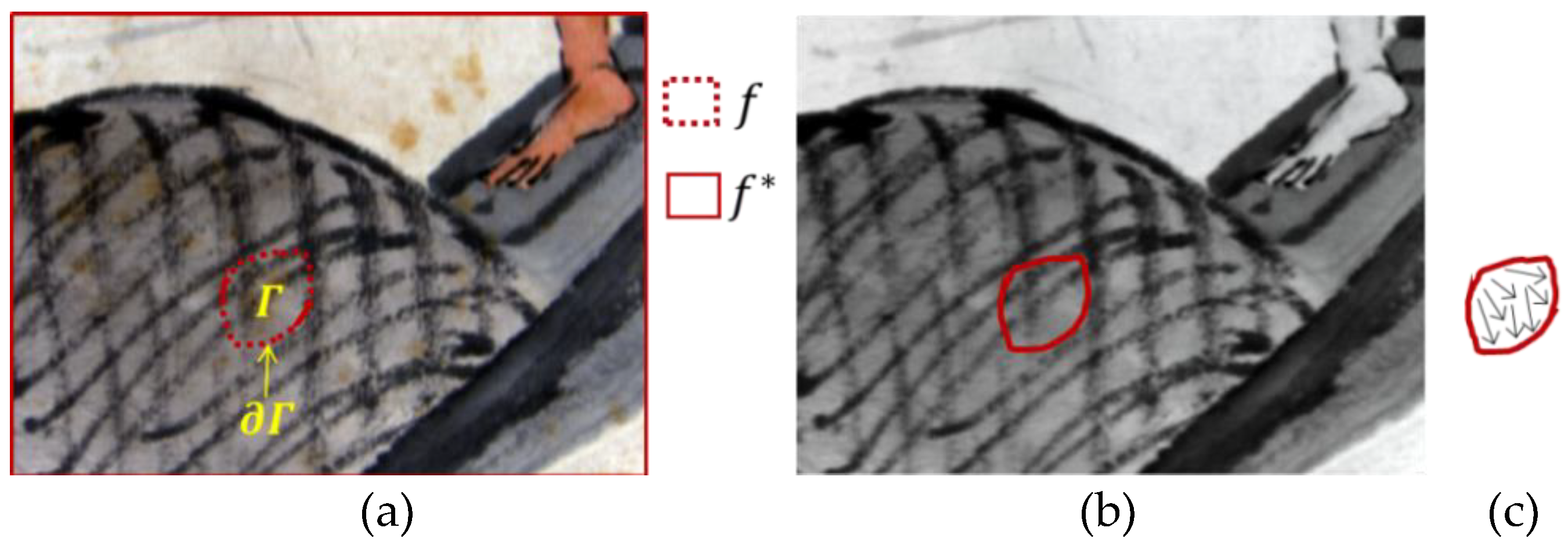 - Wu, M.; Wang, H.; Li, W. Research on multi-scale detection and image inpainting of Tang dynasty tomb murals. Comput. Eng. Appl. 2016, 52, 169–174. [Google Scholar] [CrossRef]