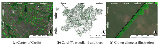 The urban forest in Cardiff, United Kingdom, is the study context (Figure 1). Cardiff is the capital of Wales, the most populous city in the country, and the 11th largest city in the United Kingdom, with a population of over 330 thousand according to the latest 2011 census. Cardiff is recognised for its extensive green urban fabric, housing over 330 parks and gardens and one of the UK’s largest parks, Bute, expanding 56 hectares and over 2000 trees [35]. In 2013, urban trees were estimated to cover 16% of the total area of the city [14]. In addition, extensive aerial surveys have been conducted by Natural Resources Wales (NRW) [14] to measure and understand tree canopy in the city. Data drawn from these surveys provide a useful framework to assess our approach. These data are described in Section 2.3.