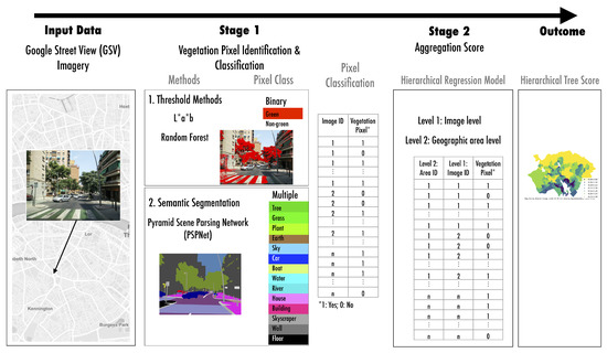 Methodological framework. Input data are obtained from Google Street View (GSV). These data are used in Stage 1 to identify and classify GSV image pixels. The three image segmentation methods are used and presented in Section 3.1: first, two threshold binary classification methods: The based method (Section 3.1.1) and a novel Random Forest improvement (Section 3.1.2); and then, a semantic image segmentation method (i.e., PSPNet) (Section 3.1.3) is proposed as an improvement. A dataset of vegetation pixel classification is derived for each image and used in Stage 2 in a hierarchical modelling framework (Section 3.2) to derive a novel tree score, to estimate street-level tree cover at an aggregate geographical level.