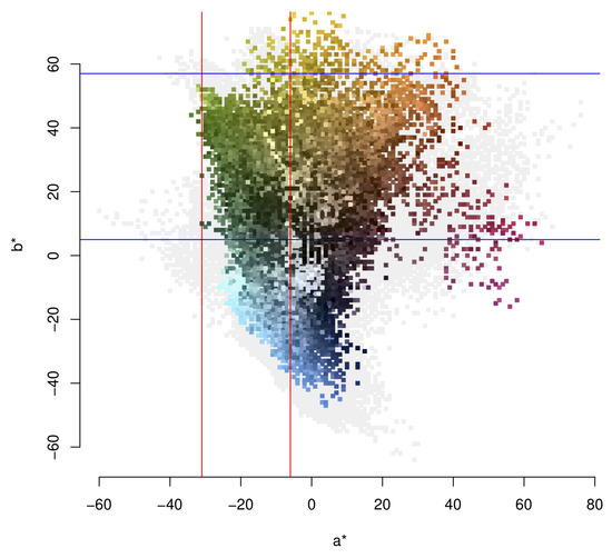 Vegetation (coloured region) and non-vegetation pixels (grey) in the Mapillary dataset. Each point represents an individual pixel from a randomly sampled set of images from the dataset. Pixels are coded according to the colour represented by the pair. The sample includes values with varying patterns of (lightness), and as such exhibits wide variability. Only pixels belonging to the vegetation class are retained, with the remaining classes colour coded as grey on the background to illustrate the overall feature space. The vertical lines extending from the axis correspond to the optimal (left), (right) parameters, while the horizontal lines extending from represent the optimal (bottom), (top) parameters.