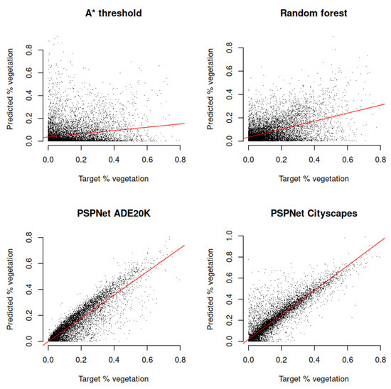 To better understand the comparative performance of the three competing approaches, Figure 7 displays the segmentation labels produced by each method and those contained in the ground-truth Mapillary dataset. The method has been omitted due to its similarity with which is a marginal improvement over . The first row consists of easily identifiable trees, which were labelled nearly perfectly by the PSPNet model and with some success by the and threshold methods. The second and third rows illustrate one of the main issues with the based methods. Green vegetation is less prevalent in autumn and winter months, and color-based only approaches perform poorly identifying un-leafy trees. The forth and fifth rows highlight another key limitation of the methods. This is in distinguishing that not all tree species are green, and not all green objects are trees. In contrast, the PSPNet model is robust to all these situations, likely due to its ability to learn beyond the characteristics of an individual pixel and into the structure of the overall arrangement of pixels as discussed in Section 3.1.3. Further, Figure 8 illustrates the relationship between the actual percentage vegetation and our predicted percentage vegetation over approximately 10,000 images in the Mapillary dataset.