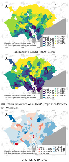 Comparison of Urban Forest scores. (a): Multilevel Model (MLM) Scores. (b): NRW vegetation percentage cover scores. (c): the difference between the MLM score and the NRW vegetation estimates.