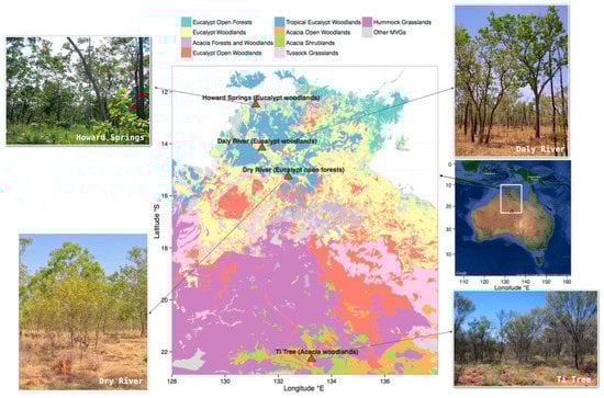 Spatial extent of the North Australian Tropical Transect (NATT) study area. The red triangles indicate the locations of the four local sites. Background is the map of the Australian Major Vegetation Groups (MVGs, V4.1), provided by the Australian National Vegetation Information System. Central-right panel shows the locations of the study area over the Australian continent (image source: Google Earth). Photographs show the ground-view of each flux tower site (image credit: www.OzFlux.com). Top-left—wet season at Howard Springs; bottom-left—dry season at Daly River; top-right—dry season at Dry River; bottom-right—woodland floor and understorey at Ti Tree.