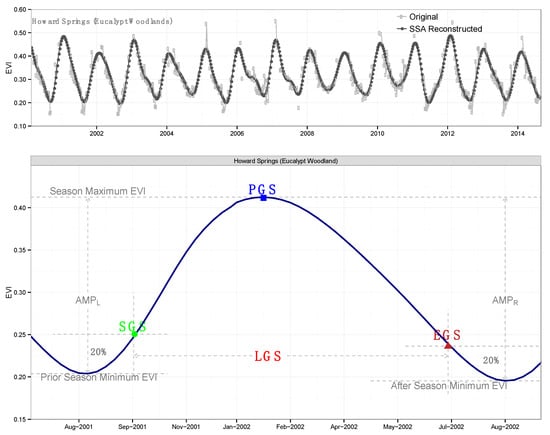 Diagram of the Singular Spectrum Analysis (SSA)-Pheno algorithm for deriving phenological metrics. The top panel shows the original MODIS VI time series and SSA-reconstructed VI time series for Howard Springs (Eucalypt woodland) from 2000 to 2014. The bottom panel shows the diagram for extracting phenological metrics using a VI profile of Howard Springs in 2001–2002. Phenological transition dates, including the start of growing season (SGS), the peak of growing season (PGS), the end of growing season (EGS), as well as the length of growing season (LGS) are labelled on the graph. SGS is defined as the timing when the enhanced vegetation index (EVI) passes the 20% threshold of the seasonal amplitude during the greenup phase (seasonal maximum EVI–prior season minimum EVI), and EGS is defined as the timing when EVI passes the 20% threshold of the seasonal amplitude during the browndown phase (seasonal maximum EVI–after season minimum EVI).