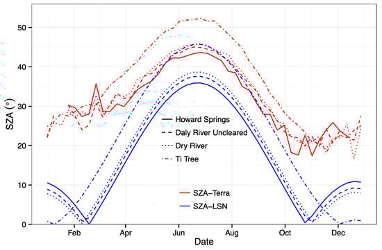 Solar zenith angle (SZA) exhibited a seasonal cycle that also varied across sites (Figure 3). The range of seasonal variations in SZA increased with latitude, with the SZA-Terra ranging from about 17–44°, at Northern Howard Springs (12.5 °S) to about 18–52° at Southern Ti Tree (22.3 °S) (Figure 3). Seasonal dynamic ranges of SZA was enhanced by SZA-LSN, varying from about 0–36° at Howard Springs to about 0–46° at Ti Tree, all much larger than the observation range that the Terra satellite experiences (Figure 3).