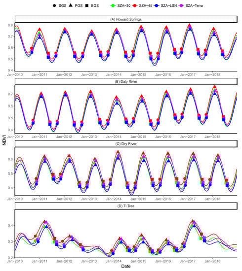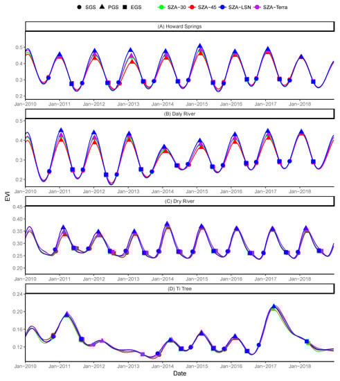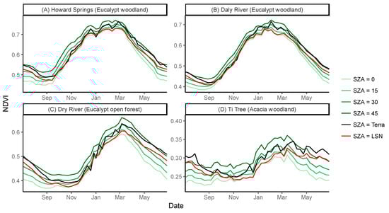 Previous studies using remote sensing for deriving vegetation phenology have primarily used observations taken at the satellite overpass time (e.g., AVHRR, MOD/MYD13 or MOD/MYD09) without correction of both solar- and view-angle effects [,,], or have been only partially corrected for the view-angle effect (e.g., MCD43 Nadir Bidirectional Reflectance Distribution Function (BRDF), Adjusted Reflectances (NBAR)) []. MODIS NBAR normalises surface reflectances to the nadir view, but sun-angle still varies seasonally at the local solar noon, at any given site [,]. Both field measurements and remote sensing data have shown that surface reflectances and vegetation indices are solar-angle-dependent [,,], and using observations without proper correction of the sun-angle effect for deriving phenological metrics can introduce artefacts that do not reflect real, ground-level vegetation dynamics.