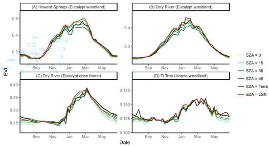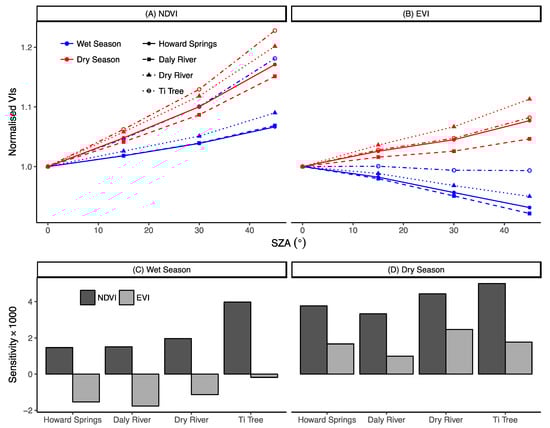 To investigate the sensitivity of NDVI and EVI to sun-angle at any given date, VIs fixed at four sun-angles (all nadir view), VISZA-0, VISZA-15, VISZA-30 and VISZA-45, were plotted with respect to the sun-angle. Due to the seasonal variations in the quantity of greenness, the four VIs were normalised by VISZA-0 at any given site/date to focus on the slope (sensitivity) and percentage change relative to VISZA-0. There were considerable differences in the sensitivity of VIs to the sun-angle across sites, between the wet season (February) and the dry season (July), and between NDVI and EVI (Figure 6). First, sensitivity of VIs to sun-angle was generally larger during the dry season than during the wet season (except for EVI at the Daly River site) (Figure 6). Additionally, the dynamic range of the sensitivity of VIs to sun-angle was larger at Howard Springs, Daly River, and Dry River sites than at the Ti Tree site (Figure 6). Except for the wet season at Howard Springs and the Daly River sites, where the sensitivity of NDVI and EVI to SZA was similar, for the other sites, the sensitivity of NDVI to sun-angle was generally greater than the sensitivity of EVI during both the wet and dry seasons (Figure 6C,D).