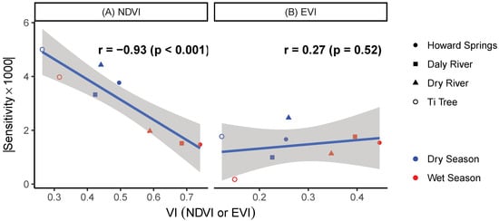 Furthermore, only positive responses of NDVI to sun-angle variations were observed, while EVI exhibited both positive and negative responses (Figure 6C,D). During the dry season (with only evergreen trees present), EVI across all sites increased with increases in SZA, while during the wet season (with both trees and green grass present), EVI decreased with increasing SZA (Figure 6B). We further examined the relationship between VI sensitivity to SZA (in absolute values) as a measure of the overall sensitivity regardless of signs and vegetation cover (measured by NDVI or EVI), across sites and seasons (Figure 7). A strong negative correlation between NDVI sensitivity to SZA (in absolute value) and vegetation cover was observed (r = −0.93, p-value < 0.0001), while no significant correlation between EVI sensitivity to SZA (in absolute value) and EVI-level was observed (r = 0.27, p-value = 0.52) (Figure 7). On average, NDVI and EVI sensitivities to SZA were 0.0031 ± 0.0014 and 0.0003 ± 0.0007, per degree change in the SZA across site/season (Figure 7). It is also worth noting that only when vegetation cover approached very high levels (NDVI > 0.6), as during the wet season, did the NDVI sensitivity to SZA decline to low levels, comparable to those of EVI (Figure 7).