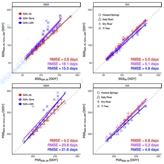 Cross-site relationship between the phenological metrics extracted from NDVI and EVI with different SZA configurations across four NATT sites. SGS—start of greening season; and PGS—peak of greening season. Phenological metrics extracted from the NDVI and EVI with three different SZA configurations (all at nadir view), with SZA varying according to the Terra overpass time (SZA-Terra) and the local solar noon (SZA-LSN), or fixed at 30° (SZA-30) or 45° (SZA-45).