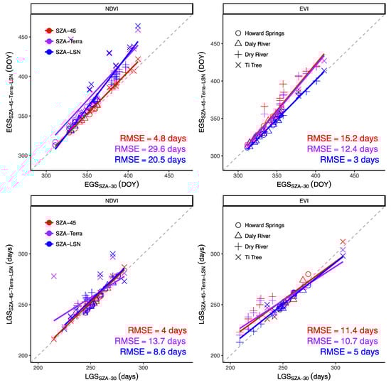 Cross-site relationship between the phenological metrics extracted from NDVI and EVI, with different SZA configurations across four NATT sites. EGS—end of greening season; LGS—length of greening season; And DOY—day of year, started on July 1. Phenological metrics extracted from NDVI and EVI with three different SZA configurations (all at nadir view), with SZA varying according to Terra overpassing time (SZA-Terra) and local solar noon (SZA-LSN), or fixed at 30° (SZA-30) or 45° (SZA-45).