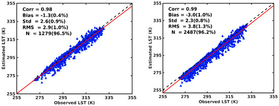 We have conducted an inter-comparison between MOD11_L2 and our LST retrievals. Before comparison, the MOD11_L2 data are rescaled to 0.05 × 0.05 degree latitude/longitude grids.