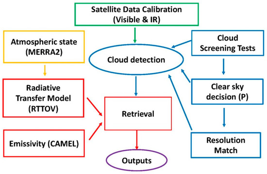 Here, the approach is based on the Radiative Transfer for TOVS (RTTOV) model v11.2 [53,54,55] adjusted for the GEO characteristics and driven with MERRA-2 reanalysis fields. The CAMEL data are also implemented in the method. The advantage of this approach is that it is consistent with the retrieval approach used at JPL to generate the MOD21 product [56]. The processing sequence is described in Figure 2.