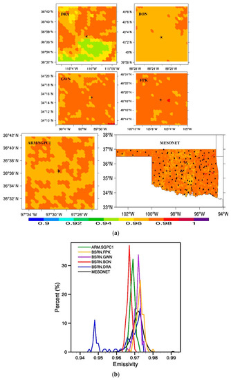 (a) Spatial characterization of the sites used in evaluation of the LST products in terms of emissivity as obtained at 1 km spatial resolution using the ASTER Global Emissivity Dataset 1 km V003. (b) Frequency distribution of the emissivity values over sites used in evaluation as illustrated in Figure 3a.