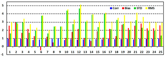 Evaluation of 25 instantaneous match-ups of LST retrievals from GOES observations against MOD11_L2. The x-axis provides the numbering of the cases while the y-axis indicates the correlation (in blue) and the other variables in W/m2.