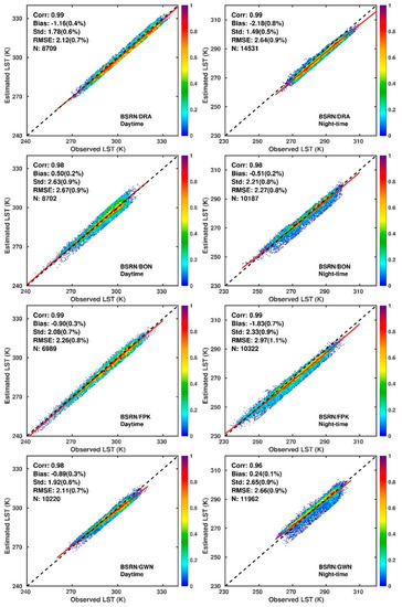 Evaluation of LST for 2004 against a SURFRAD/BSRN station at Desert Rock, NV (DRA) for: Left: daytime; Right: nighttime.