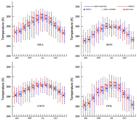 Since surface ground observations are limited, shelter temperature has been widely used as a proxy to surface skin temperature to meet large-scale needs. Issues emerging from such an approach have been addressed previously [2]. While observations from satellites are considered useful for inferring LST, only a few satellite sensors observe all the necessary parameters needed to derive LST with high accuracy. Some lack sufficient number of channels to account simultaneously for atmospheric effects (as needed for implementing the “split window” approach) [3,4,5,6,7]. Others do not observe the Earth surface at high frequency to resolve the diurnal cycle, or at high spatial resolution, to minimize the presence of clouds.
