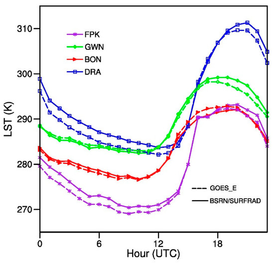 A six-year average (2004–2009) of the hourly LST at four SURFRAD/BSRN stations as observed (solid line) and as derived from the GOES observations (broken line).
