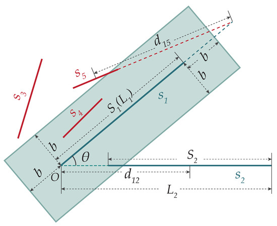 - Distance constraint. The intersection may be on the segment extension line. If it is very far from the line segment, the positioning accuracy will be reduced and the intersection may not make sense; thus, the distance constraint is needed. The distance between and is defined as the distance between the midpoint of shorter line segment and their intersection, which must meet .