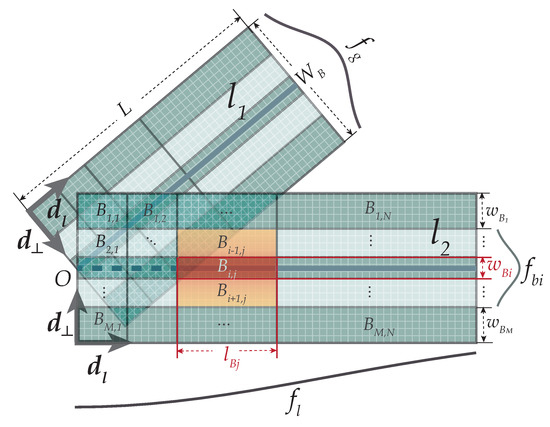 The framework of the LIL descriptor is shown in Figure 4, which is a double-rectangular shape. The descriptor framework consists of two line support regions (LSR), which are centered at lines and . The width of each LSR is , and the length is equal to that of the center line, i.e., or . Each LSR is divided into M segments along the length direction, N segments along the width direction, i.e., blocks. The whole LIL contains blocks, for a total of two LSRs. Figure 4 shows an example where , for a total of 40 blocks. For one LSR, the block of the ith row jth column is denoted as , with a width of and length of , where , . The width will be smaller with closer to the center line. Consequently, the discriminability of descriptors will increase, and features will become increasingly fine near the center line. An example in Figure 4 shows that the corresponding widths of are pixels, which are determined by empirical values in practice. Similarly, the descriptor is centered on the intersection, so blocks near the intersection should be finer. Therefore, the closer is to the intersection, the smaller the length . is determined by the following Formula (3):