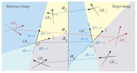 LIL divides the image into four parts, and the LIL local coordinate system is defined with the intersection O as origin, and and as coordinate axises, as shown in Figure 5. The left side and the positive half of coordinate axis are defined as positive, whereas the right side and the negative half of that are negative, constituting four quadrants . For any two LIL matches in , and , the quadrant of in coordinate system on the reference image is calculated, i.e., . Similarly, the quadrant of in the coordinate system can be obtained on the target image. As shown in Figure 5, for match under the local coordinate system of match , , ; instead, for under the coordinate system, , .