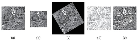 Images with simulated trasformations. (a) Original image; (b) Scale; (c) Rotation; (d) Illumination; (e) Cloud cover.