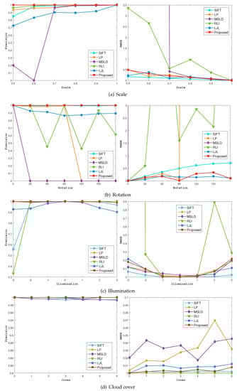 Figure 7 shows the and of the different algorithms tested on simulated images. The scale ratio ranges from 1 to 0.5, and the rotation angle is in the range of . Illumination variations are simulated by increasing or decreasing the image intensity. In Figure 7c, negative coordinates indicate dark illumination, and positive coordinates indicate bright illumination. Regarding occlusion, cloud patches are extracted from a real remote sensing image with cloud cover (with gray value 230∼255), which are added randomly to the test image with the number of patches varying from 8 to 20.