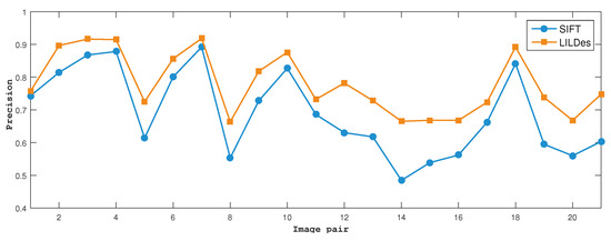 In order to validate the superiority of the LIL local descriptor, this study compares it with the SIFT descriptor on simulated images with large background variations which are different combinations of scale, rotation, illumination, and occlusion variations. Feature points are intersections extracted by the LIL detection in all experiments, and are described by SIFT and LIL descriptors, respectively. Figure 8 shows the precisions after brute force matching. Overall, the precisions of matching results using the LIL descriptor are 3% 18% higher than those using the SIFT descriptors, which proves that the LIL descriptor have higher discriminability for the same feature points. Especially for low-precision test results, the advantage of the LIL descriptor is more obvious.