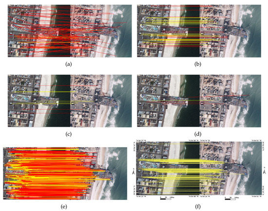 Figure 10 depicts a comparison of matching results for image pair 2. This image pair has many line features, and most buildings are kept intact before and after the hurricane. However, viewpoints change slightly between this image pair, so the tilt and shadow of buildings will considerably impact line feature-based algorithms. The line segments or intersections of the top of buildings are in different positions in the reference and target images because the top of the building is not in the same plane as the ground. Consequently, matching error easily occurs. The false matches of LJL in Figure 10e are mostly at the top of buildings. The proposed algorithm eliminates many false matches at the top of buildings, and the reserved matches are mostly clustered on the ground, thus ensuring registration accuracy.