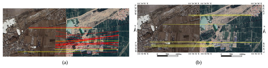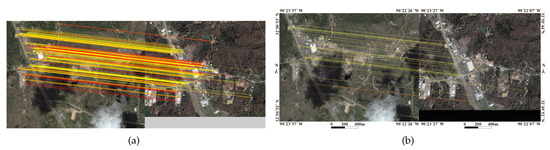 Figure 9, Figure 10, Figure 11, Figure 12, Figure 13 and Figure 14 illustrate the matching results of these algorithms. The yellow and red lines indicate correct and false matches, respectively. Figure 9 shows a comparison of matching results for image pair 1. Bridges and buildings undergo great changes over time. Figure 9a shows that many false matches which do not conform to the spatial relations are detected by SIFT. As shown in Figure 9b–d, the matches detected by LP, MSLD and RLI are low in quantity, distributed unevenly, and have many outliers, so they cannot realize correct registration. Although LJL detects numerous matches, as shown in Figure 9e, the final matches are clustered on the right side of the image because the bridge on the left side changes greatly and has few features. Consequently, the registration accuracy of LJL is relatively low. The matching intersections detected by the proposed algorithm are uniformly distributed, so higher accuracy can be obtained.