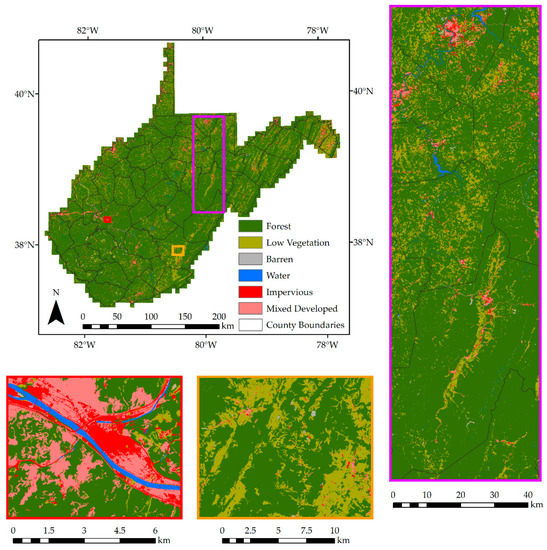 This mapping project was conducted for the entire state of West Virginia, USA (see Figure 1), which covers a land area of roughly 62,000 km2. The state has a humid continental climate with an average winter temperature of 1°C and an average summer temperature of 22°C. It ranges in latitude from 37°N to 41°N and in elevation from 150 m to 1500 m. Rainfall varies from an average 64 cm per year in the eastern panhandle to an average 160 cm per year on west-facing slopes in the highest elevations of the Allegheny Mountains physiographic section. The state is dominated by forested land cover, including mixed, oak dominant, northern hardwood, and northern evergreen forests [72]. Based on the 2011 NLCD land cover, the state is roughly 80% forested, 11% hay/pasture/herbaceous/cultivated crop, and 7% developed. It is topographically rugged, with variable elevation. The western portion of the state has moderate to strong relief within a mature plateau dissected by a dendritic stream network. The eastern portion of the state occurs predominately within the Ridge and Valley physiographic province, which is characterized by linear ridges and valleys with a trellis stream network [72].