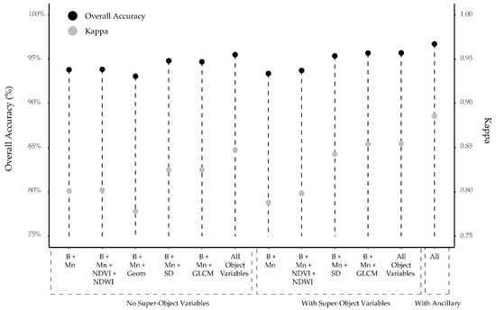 In comparing the result using spectral brightness and band means from just the objects with that when brightness and means were incorporated from the super-objects, a 0.4% decrease in overall accuracy and a 0.003 decrease in Kappa were observed; however, this difference was not found to be statistically significant (z-score = 0.070). In comparison to using just the object brightness, band means, and standard deviation, accuracy increased by 0.5% and Kappa increased by 0.018 when adding in these measures from the super-objects, which was statistically significant (z-score = 4.152). Similarly, overall accuracy increased by 1.0% and Kappa increased by 0.029 when brightness, band means, and GLCM super-object measures were incorporated in comparison to just using those at the object-level, which was found to be statistically significant (z-score = 9.487). Using all image-derived variables, including measures of central tendency, texture, and object geometry, provided an overall accuracy of 95.5% and a Kappa statistic of 0.848. Once the super-object features were added in, accuracy increased by 0.2% and Kappa increased by 0.006, which was found to not be statistically significant (z-score = 1.338). In general, although the overall accuracy did not increase substantially, this research suggests that incorporating super-object attributes were of value, especially textural measures, similar to the findings of Johnson [51] and Johnson et al. [52].