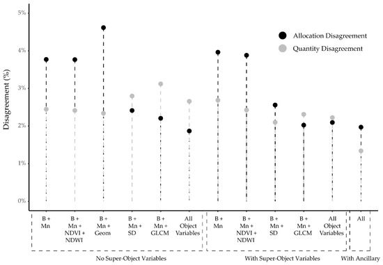 Quantity and allocation disagreement comparison for different feature spaces.