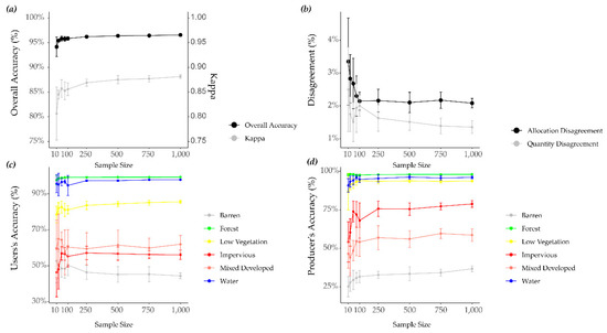 These graphs show results when using all image-derived and ancillary variables. (a) Change in overall accuracy and Kappa with varying sample size. (b) Change in quantity and allocation disagreement with varying sample size. (c) Change in user’s accuracy per class with varying sample size. (d) Change in producer’s accuracy per class with varying sample size.