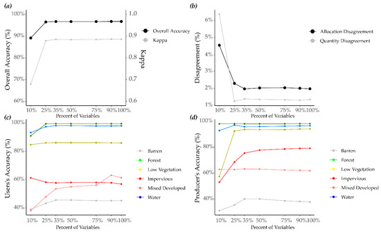 These graphs show results when using all image-derived and ancillary variables. (a) Overall accuracy and Kappa vs percent of variables. (b) Quantity and allocation disagreement vs percent of variables. (c) User’s accuracy per class vs percent of variables (d) Producer’s accuracy per class vs percent of variables.
