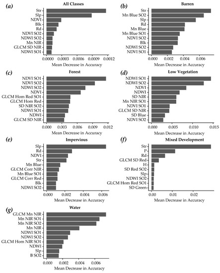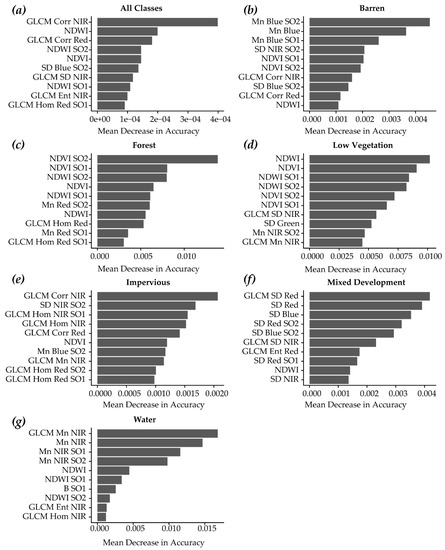 Figure 6 provides the conditional variable importance of the top ten variables for the entire model (Figure 6a) and for each individual class (Figure 6b–g) using all input features. For mapping all six classes, many ancillary measures were found to be important, including mean structure density (Str), topographic slope (slp), Census block density (Blk), and road density (Rd), highlighting the value of incorporating ancillary variables. Further, mean structure density and mean topographic slope were found to be the most important variables. Important spectral variables include NDVI and Mean NIR (Mn NIR). Additionally, measures calculated at super-object levels were found to be important, including NDVI and NDWI, suggesting that incorporating super-object measures was of value. It is interesting that NDVI and NDWI were found to be important variables; however, as discussed above, the incorporation of these variables did not statistically significantly improve the classification accuracy. A possible reason for this is that the algorithm may be able to obtain the comparable information from the bands used to calculate the indices.