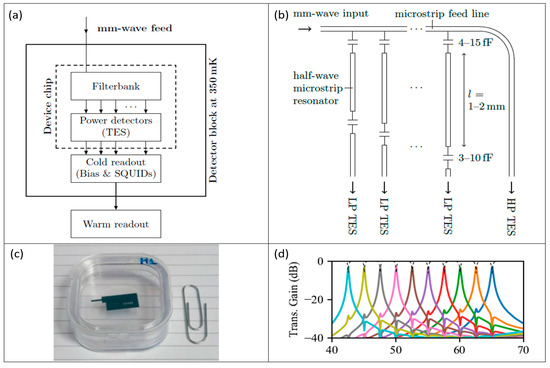 An example of one such technology advancement is the development of on-chip superconducting filterbank spectrometers. This state-of-the-art technology will enable hundreds of spectral channels in the MW region, with individually tailored bandwidths, and resolution (ν/Δν) greater than ~1000, sensed down to the photon-noise limit [16]. Superconducting filterbank spectrometers differ from “conventional” heterodyne-based solutions in three main ways. Firstly, there is no down conversion stage; both the filters and power detectors operate at the signal frequency. Secondly, both the filterbank and detectors are implemented using superconducting technologies. Thirdly and importantly, the filterbanks and detectors are integrated together on the same device chip. The basic concept is illustrated in Figure 1.