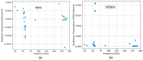 Comparison of fast and line mode of the EIPS framework radiative transfer model, the HT-FRTC: (a) Brightness temperature bias (calculated for fast code compared with the line HT-FRTC code). (b) Brightness temperature standard deviation between fast and line HT-FRTC code.