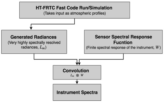 The advantage of using a fast mode of the HT-FRTC within the EIPS framework is that it does not require instrument-specific coefficients, in comparison to conventional fast radiative transfer models like the Radiative Transfer for TOVS (RTTOV; TOVS stands for TIROS Operational Vertical Sounder and TIROS for Television InfraRed Observation Satellite) [27]. The fast mode uses a small number of about 300 monochromatic frequencies as predictors for the PC scores. The PCs themselves are derived during the training at a very high spectral resolution (HT-FRTC calculations were done at a spectral resolution of 3 MHz) and are independent of any instrument parameters. Simulated spectra for any particular instrument can be constructed by the convolution with the sensor SRF either on the level of radiances or on the level of PCs. Convolution of highly spectrally radiances with instrument specific SRFs offers the flexibility of taking any type of instrument line shape only at the last step of the process. This process of construction of instrument simulated spectra using convolution of highly spectrally resolved radiances with sensor SRFs is represented in the flow diagram in Figure 5. This specific property of HT-FRTC makes it very useful for studies related to new instruments and for investigating large number of instrument configurations.