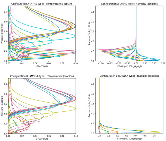 Simulated temperature and humidity Jacobians for two MW instrument configurations (A and B): Temperature and Humidity Jacobians for configuration A (ATMS-type) (shown in two figures in the top panel) and for configuration B (AMSU-A-type) (shown in side-by-side two figures in the bottom panel).