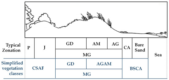 Schematic representation of the typical vegetation zonation [34] and the five simplified vegetation classes adopted in the present study after the in-situ botanical survey. For abbreviations, see main text.