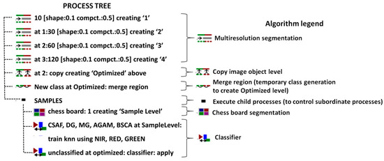 The ML method assumes that pixels of each class belong to a multivariate normal distribution and defines the probability density function for each class. Each pixel is assigned to the class that it has the highest probability of being in [49]. Comparatively, the NN classifier uses spatial features to classify the object, based on the closest training examples and on the class in which its neighbors have been classified. The NN classification required a previous segmentation step. This phase was performed using a multilevel segmentation approach, and in addition to the tri-bands orthoimage, the normalized difference vegetation index and digital surface models were used as input layers. The multiresolution segmentation algorithm was used to generate the image objects. Four levels of segmentation were applied, which defined the color and shape parameters, with the scale parameter increased at each level (Figure 4). The scale parameter was set to define the level of heterogeneity. Each level was evaluated by photo-interpretation. The optimized level was generated by combining the object levels. The optimized level comprised large segments in homogeneous areas and distinctively smaller image objects that represented small-scale structures and heterogeneous regions [50,51]. The class sample shapes were imported in the eCognition software to identify the objects that corresponded to the areas of interest. Therefore, the sample level was created by chess-board segmentation. Finally, the classification procedure was applied to image objects at the optimized level.