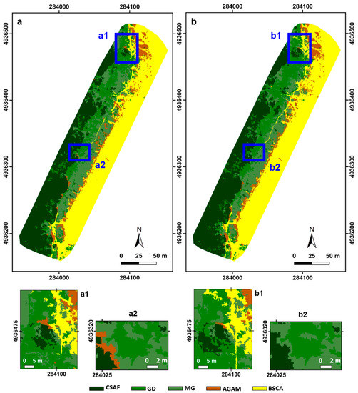 Both of the classification algorithms recognized the five vegetation classes considered as irregular belts almost parallel to the coastline: BSCA, AGAM, MG, GD, and CSAF (see Figure 2).