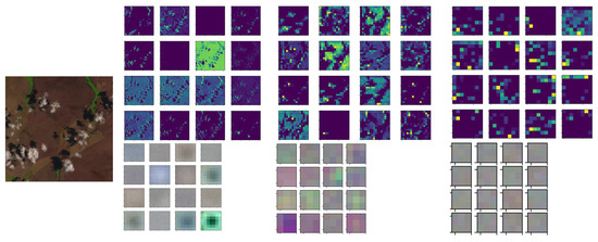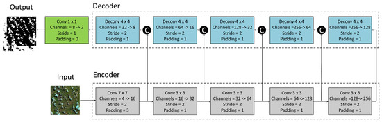 To exemplify, let us consider the input image with a size of 256 × 256 with four spectral channels, the first encoder layer takes as input such 256 × 256 image and outputs 16 feature maps with a size of 128 × 128. Then, the second layer takes as input 16 feature maps with a size of 128 × 128 and outputs 32 feature maps with a size of 64 × 64. Therefore, by proceeding into deeper layers in the encoder, the generated feature maps resolution decreases as their number increases. At the end, the last encoder layer output 256 feature maps with the resolution of 8 × 8 pixels.