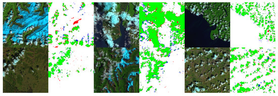 The results of the proposed network (1-st row in Table 1) over six test images of SPARCS dataset. Green and white pixels represent true positive and true negative while blue and red pixels represent false negative and false positive outputs, respectively.