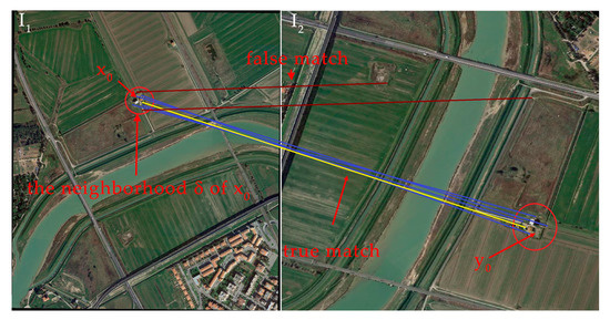 If the feature points are defined ( in the neighborhood of ), then its corresponding correct matching point must also be in the neighborhood of the corresponding correct matching feature point of . Namely,