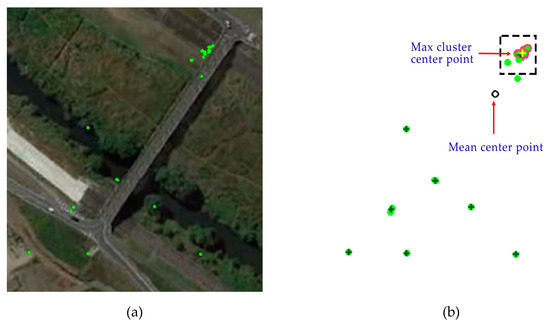 Due to the consistency distribution of the true matches, the position of match points has the effect of aggregation. From the perspective of the standard deviation, the data are stable and easily distinguishable. Even if the number of mismatched points of some grids is greater than that of true matching points, because the mismatched points are random and discrete, it is easy to exclude the mismatched points by identifying mismatched points with large data fluctuations and standard deviations. Therefore, a clustering method is used to obtain the center point of the feature matching, as shown in Figure 5 (the black point is the mean center point, and the blue one is the clustering center point). Meanwhile, the clustering center point is used to analyse the volatility of its standard deviation.