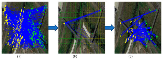 Schematic diagram of the UGC algorithm matching strategy: although false matches are completely rejected, it is clear that a large number of true matches are also rejected. (a) Initial matching results, (b) matching results after a grid clustering, and (c) UGC final matching results.