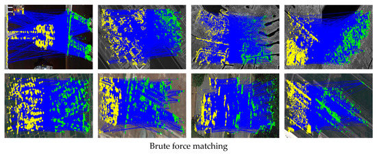 The left figure is the matching result of the brute force algorithm, and the right one is the matching result of the feedback unilateral grid-based clustering (FUGC) algorithm. The brute force (BF) algorithm relies on comparing each feature point with all possible candidate feature points belonging to the corresponding search area by computing the distance between feature points. The yellow points and green points represent feature points. The blue lines represent all matches. Clearly, the FUGC algorithm not only ensures the accuracy of matching but also retains as many correct matches as possible.