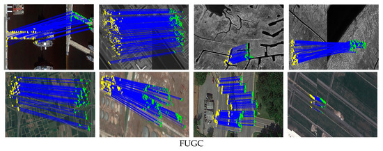 Some representative image matching effects selected from the testing dataset are displayed in Figure 9. These eight images correspond to four datasets—DOTA, NOAA, RSOD and UCAS—where each dataset contains two typical image pairs. It is a challenging task to establish a reliable correspondence between these images due to problems such as the small overlap involved, severe noise, large change in viewpoint transformation, or low resolution. The matching results of the FUGC algorithm and several other state-of-the-art feature matching methods, including RANSAC, VCF, GSM and UGC, are shown in Figure 9. The beginning and end of each blue line in Figure 9 correspond to the positions of the corresponding feature points in the two images, and the red line and red box are partial false matches. Since the simple and fast brute force matching strategy is used instead of some complex strategies to construct the assumed correspondence, at the same time, the average number of matches in the initial hypothesis set is set to 3000; to make the dataset challenging, the true matching percentage in the initial hypothesis is set to be relatively low.
