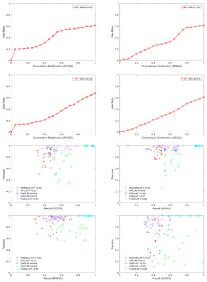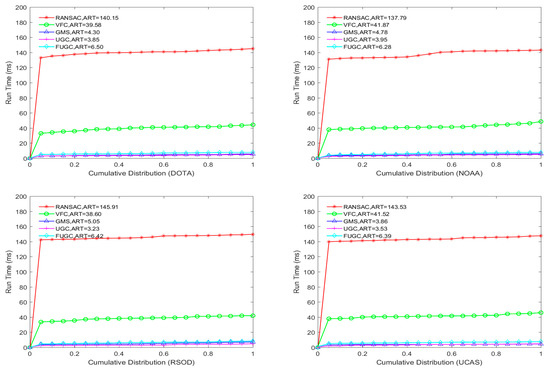 The initial inlier ratio, precision recall rate and the running time of various methods are shown in Figure 10. The initial inlier ratio is the precision of 3000 feature matches after brute force matching. The initial inlier ratio in the UCAS dataset is very low, whereas the average inlier ratio (AIR) is only approximately 29.7%. The third and fourth line of Figure 10 shows the precision and recall rate of each algorithm, in addition to the respective calculated average F1 scores. In the figure, the precision and recall rate are selected through equal intervals after sorting all the precision and recall rates. It is observed that both the precision and recall rate of RANSAC are poor, especially in the case of a low inlier ratio, such as that of the UCAS dataset, where it performs much worse. The recall rate of VFC is relatively higher, but the precision is not good, mainly because this algorithm results in the retention of a large number of false matches in order to retain more true matches. GMS and UGC have higher precision but a lower recall rate. Because their strategy is to strictly reject false matches, a large number of true matches are also removed. In comparison, the FUGC method obviously has the best matching performance on all datasets, with the precision and recall rate of most image pairs being close to one. In addition, on all four datasets, the precision, recall rate and the average F1 (AF1) score of FUGC are all higher than those of other algorithms, indicating the effectiveness of the feedback verification strategy of FUGC.